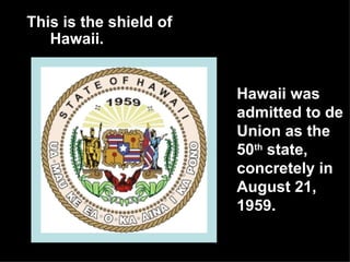 This document provides information about Hawaii, including its flag, official languages, population, area, capital city, climate, religions, and several important locations. Some key facts are: Hawaii was admitted as the 50th US state in 1959; its official languages are English and Hawaiian; its capital and largest city is Honolulu, with a population of approximately 909,863; and its climate is considered subtropical.