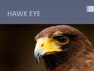 Hawk-Eye is a computer system that uses multiple cameras to track the path of a ball in sports like cricket and tennis. It was developed in 2001 and first used in a cricket match between Pakistan and England. Hawk-Eye tracks the ball using cameras, processes the images using software, and can predict the ball's path with 99.99% accuracy. It provides 3D replays of the ball's trajectory to help determine decisions in matches.