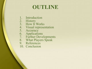 Hawk-Eye technology uses multiple cameras placed around a court or field to track the motion of a ball in 3D. It was developed in 2001 for cricket to help determine lbw decisions. The cameras record footage at 60 frames per second, which is then analyzed using computer vision algorithms to reconstruct the ball's trajectory based on triangulation. Hawk-Eye has been shown to be highly accurate and is now used in sports like tennis, cricket, and snooker to review or overturn close calls.
