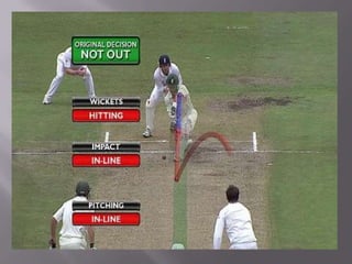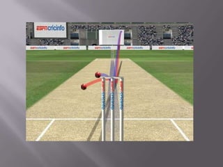 Hawk-Eye is a ball tracking system that uses multiple cameras to capture images of a ball in motion and uses computer processing to reconstruct the 3D path of the ball to determine if it was in or out of play. It was developed initially for cricket but is now also used in tennis to verify line calls. Hawk-Eye analyzes frames from 4 or more cameras to calculate the position of the ball in each frame and then maps the ball's path to determine if it was in bounds according to the rules of the game being played.