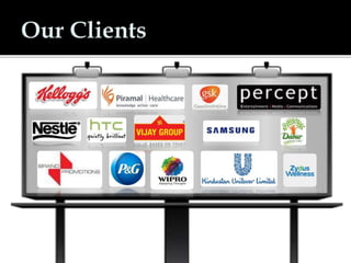 This document summarizes the capabilities of a marketing and communications company with five locations across India. It has been in business since 2000 and provides a full range of marketing services including promotions, exhibitions, merchandising, visual branding, events, and installation programs. It has an in-house printing facility and professionally trained staff. The company provides activations, launches, and campaigns for various clients across multiple industries.
