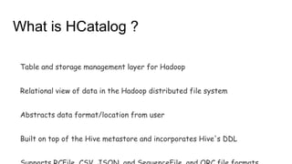 1. HCatalog is a table and storage management layer for Hadoop that provides a relational view of data in HDFS and abstracts data formats and locations from users.