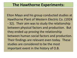 The Hawthorne experiments conducted by Elton Mayo and his team revealed that human social factors significantly influence productivity, challenging the initial focus on physical factors. Key findings include the importance of group dynamics, recognition, and the role of supervisors in enhancing employee output. These insights remain highly relevant today, particularly in emphasizing the need for attention to social aspects in organizational management.