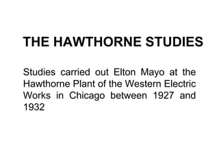 The Hawthorne Studies conducted in the 1920s and 1930s explored the impact of various working conditions on productivity. The illumination studies found that changes in lighting had little effect, while the relay assembly studies discovered that productivity consistently increased regardless of whether conditions improved or worsened. This highlighted the importance of social and human factors in influencing worker behavior and performance. The Hawthorne Effect was observed, where participants performed better simply from being observed. The studies challenged assumptions of scientific management and were influential in establishing the human relations school of management.