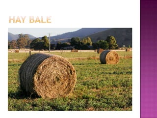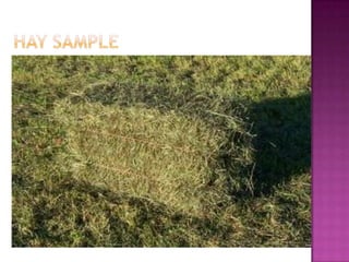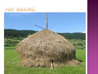 This document discusses hay making as a method for conserving green forages when fodder availability is low. It describes the steps involved, including mowing, tedding, raking and baling grasses and legumes once they have reached optimal maturity and dried sufficiently under sunlight. Losses of 10-15% of nutrients can occur during the hay making process. Proper drying and storage is important to prevent mold growth and reduce spoilage. Hay making provides a means to store forages while maintaining nutrients and quality over months until needed.