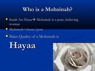 This document discusses the importance of hayaa (modesty) and hijab for Muslim women. It defines hayaa as modesty and freedom from vanity that leads one to obey Allah. The Prophet said hayaa brings good and is a branch of faith. Hijab includes lowering the gaze, voice and covering beauty except for mahrams. It should be simple and not revealing. The document encourages cultivating hayaa through knowledge and righteous company to gain Allah's blessings in this life and the next.