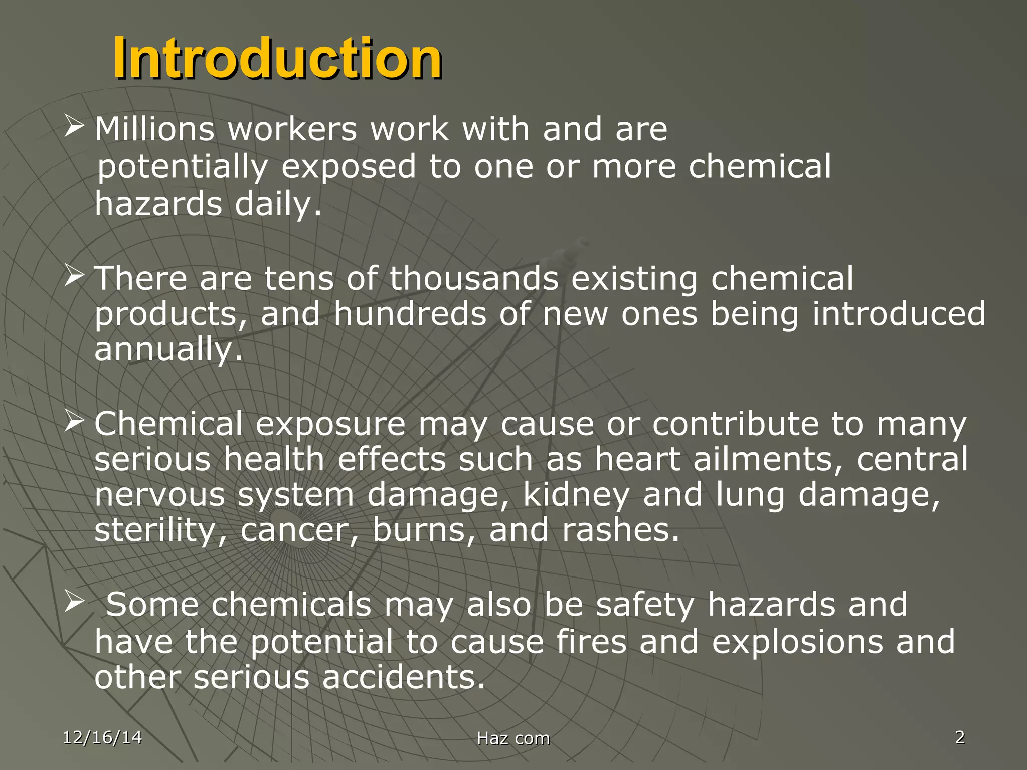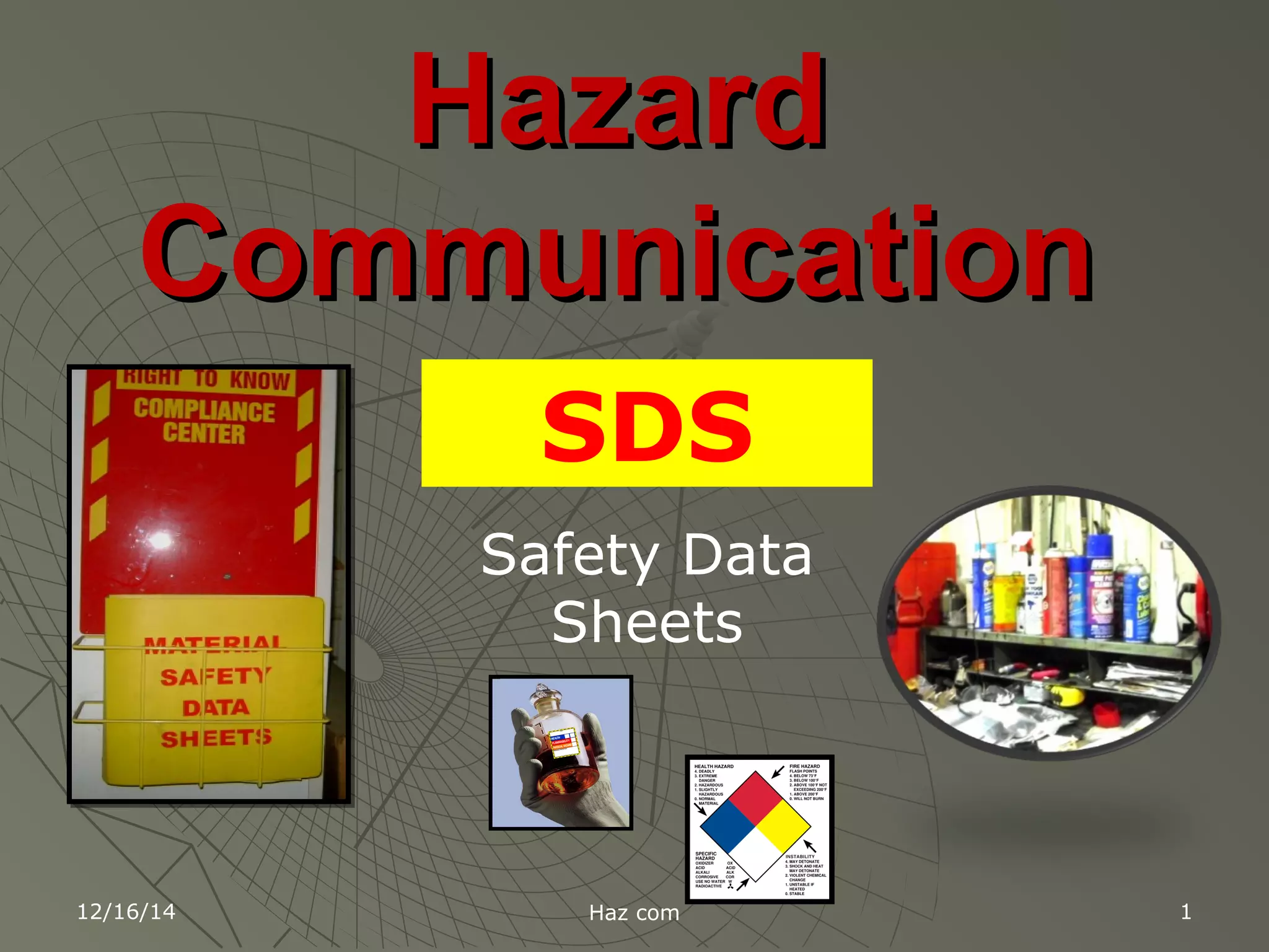 This document provides information about hazard communication and safety data sheets (SDS). It discusses that millions of workers are exposed to chemical hazards daily and that the Globally Harmonized System (GHS) was created to standardize hazard communication globally. The document notes that OSHA adopted the GHS to improve workplace chemical safety and prevent injuries. It explains that under the new system, material safety data sheets have been renamed as safety data sheets (SDS) and describes the required 16 section format for SDS. Employer requirements under the hazard communication standard are also outlined.