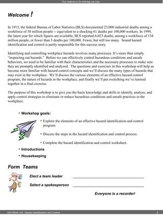The document discusses hazard identification and control, outlining the importance of identifying hazards through inspections, observations, job hazard analyses, and developing effective control programs. It notes that while workplace deaths have decreased significantly since the early 1900s, more work still needs to be done to identify and control hazards. The purpose of the training is to provide knowledge and skills to identify, analyze, and apply control strategies to eliminate or reduce hazardous conditions and unsafe practices.