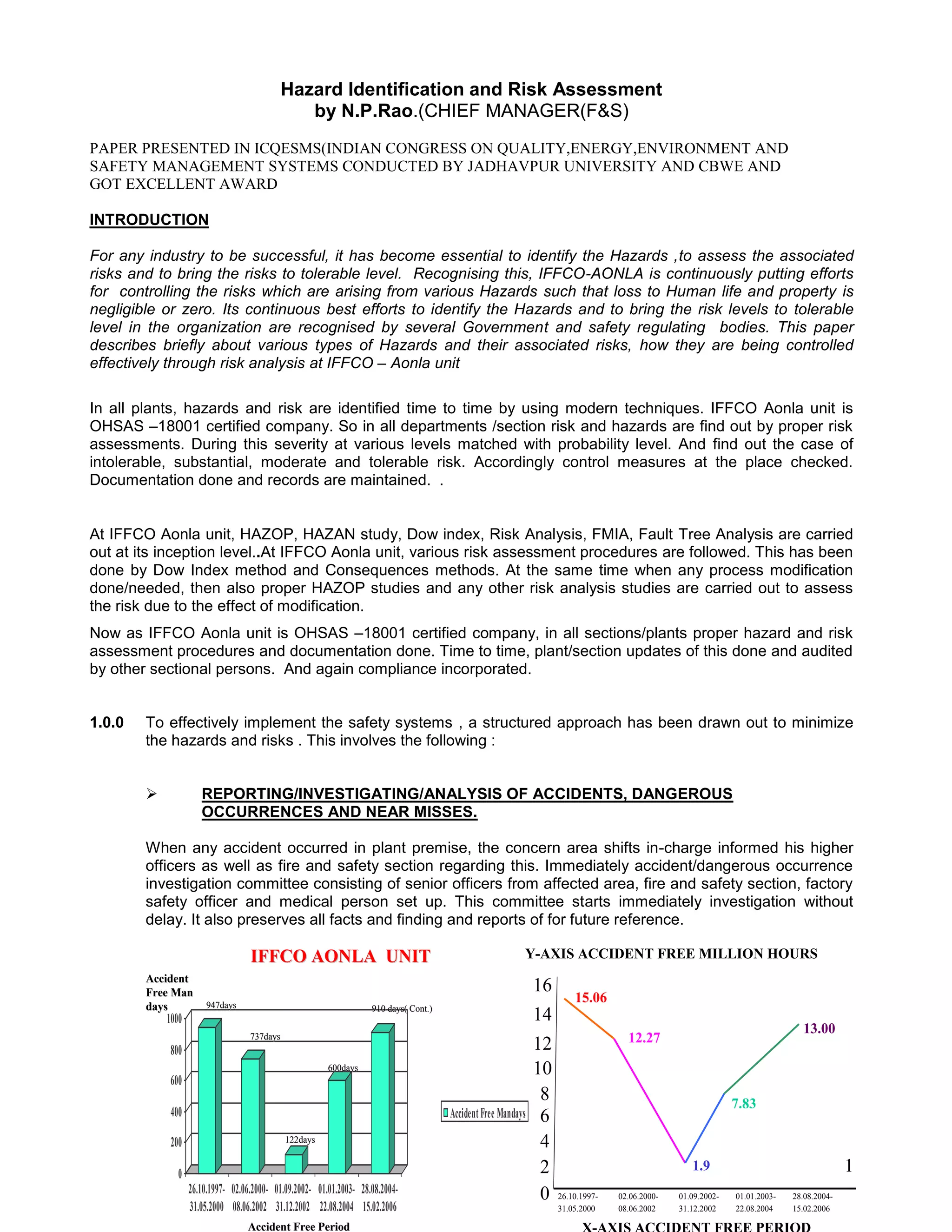 The document discusses hazard identification and risk assessment practices at IFFCO-Aonla, an ammonia and urea manufacturing plant in India. It describes how the plant systematically identifies hazards across its various departments and assesses associated risks through methods like HAZOP, HAZAN, Dow index analysis, and risk matrix assessment. Major hazards are identified as fires, explosions, chemical leaks, and thermal exposure. Control measures are documented and risks are classified as intolerable, substantial, moderate or tolerable. The plant closely monitors accidents and implements risk analysis during any process changes to minimize hazards and risks of loss to human life and property.