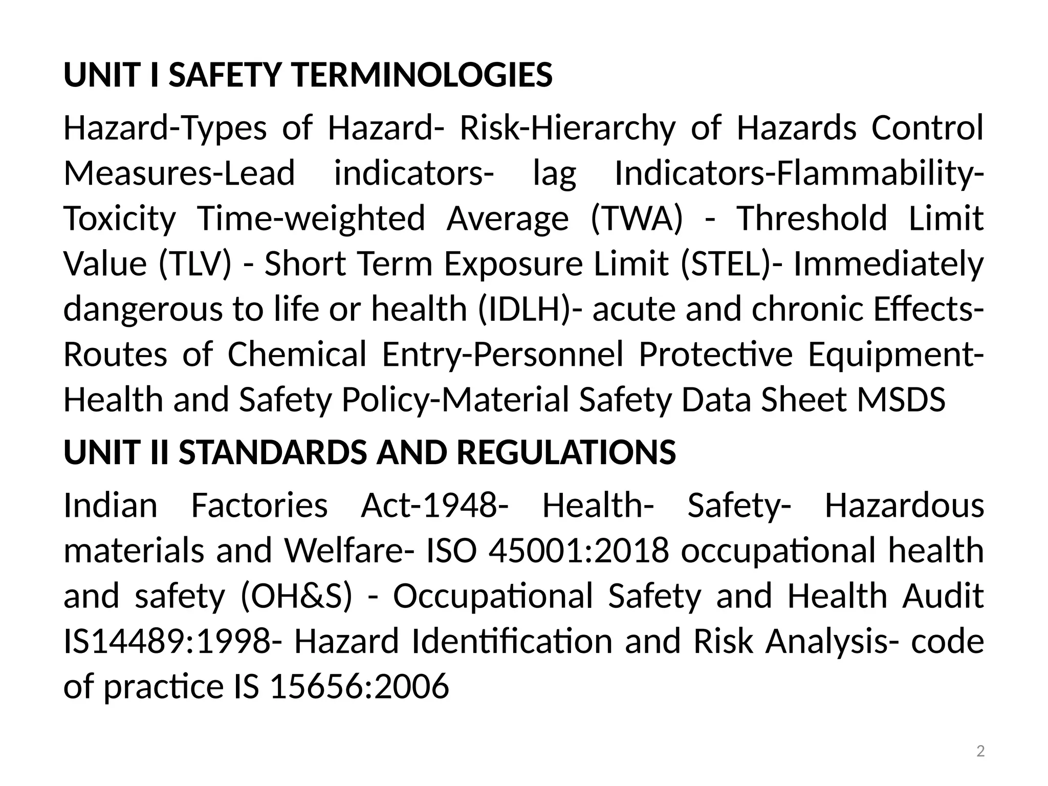 Hazard-Types of Hazard- Risk-Hierarchy of Hazards Control Measures-Lead indicators- lag Indicators-Flammability- Toxicity Time-weighted Average (TWA) - Threshold Limit Value (TLV) - Short Term Exposure Limit (STEL)-