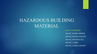 The document discusses hazardous building materials and their effects. It provides examples of common hazardous materials like asbestos, mercury, lead, and others. It describes how these materials are used in construction but can negatively impact health if inhaled, ingested, or absorbed. The document also discusses alternatives to hazardous materials that are safer to use in buildings. Overall, the document outlines the importance of identifying hazardous materials during construction to protect worker and occupant health and ensure environmental safety.