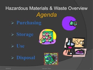 This document provides an overview of the approval processes required for purchasing, storing, using, and disposing of hazardous materials and waste at an institution. It discusses the regulatory bodies and approval committees needed for biohazards, vertebrate animals, plants, radioactive materials, lasers, chemicals, and other hazardous materials. Specific guidelines and classifications are outlined for each category. The main issues addressed are access control, proper warnings, incompatible material storage, exceeding storage limits, and ensuring safety.