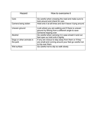 The document provides safety advice for hazards like cars, camera theft, uneven ground, alcohol, animals, and wet surfaces. It recommends being careful when crossing roads, holding cameras at all times, watching your step on uneven terrain, securely carrying alcohol to avoid cuts, avoiding vicious animals or watching for small animals, and walking slowly on wet surfaces to prevent slipping.