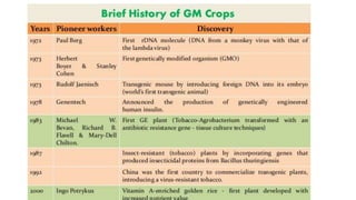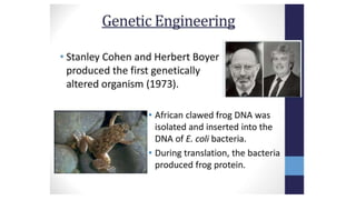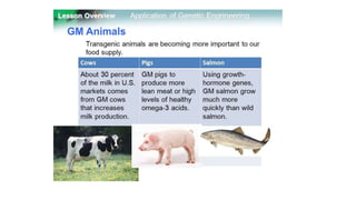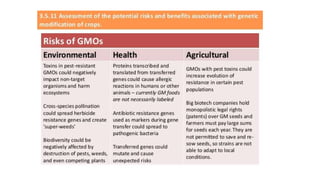 Genetic engineering and genetically modified organisms have potential risks and downsides according to the document. While genetic engineering has applications in agriculture and medicine, it can also have detrimental effects on humanity. Introducing foreign genes into other species can have uncontrolled and unpredictable consequences. Studies have shown genetically modified foods can be toxic and cause health issues in animals. Genetically engineered crops also have negative impacts on biodiversity and the environment by promoting the growth of pesticide-resistant superweeds and superbugs. The long-term effects of genetic engineering are uncertain due to its new and crude nature, making it a controversial technology that manipulates nature in ways bypassing normal evolution.
