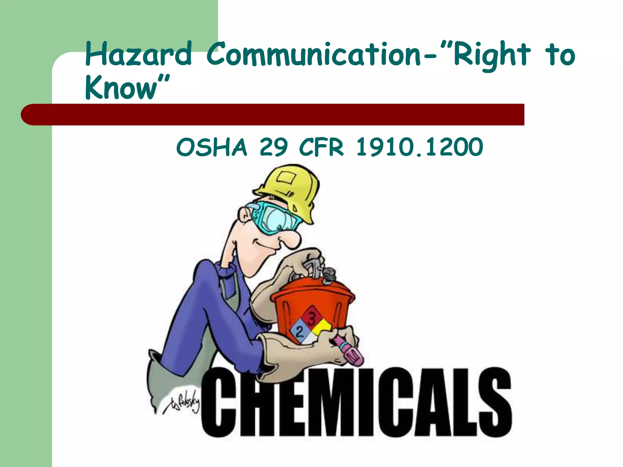 The document outlines OSHA's Hazard Communication Standard, emphasizing employees' rights to know about chemical hazards and safe handling practices. It categorizes chemical hazards into health hazards, physical hazards, and provides guidelines for protective measures and emergency responses. The importance of Material Safety Data Sheets (MSDS) and proper labeling for safety is also highlighted throughout the document.