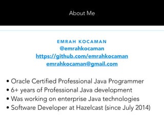 This document provides an overview of Hazelcast, a leading in-memory data grid solution. Hazelcast provides distributed data structures, execution services, and caching capabilities. It allows applications to scale linearly by adding additional nodes. Hazelcast can be configured via XML, API or Spring and supports features like transactions, custom serialization, and native client libraries. It integrates with Spring Framework for caching and can discover nodes via multicast or TCP/IP lists to form clusters across distributed systems.