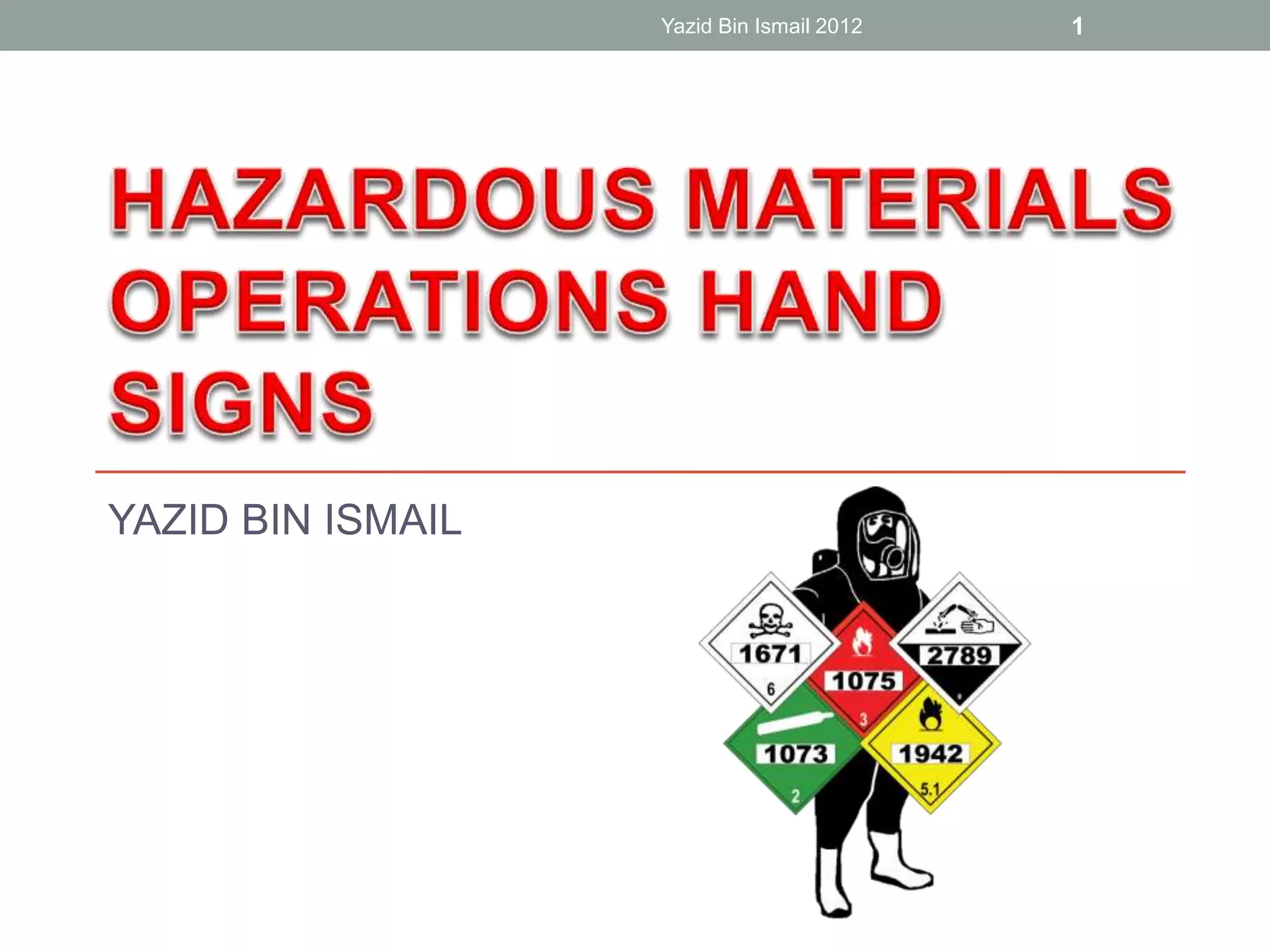 The document describes various hand signals used in firefighting situations to communicate important information non-verbally. It provides the purpose and motion for over a dozen signals including indicating well-being, low air in supplies, danger, requesting assistance, and whether a mission succeeded or failed. The hand signals allow firefighters to silently alert one another to hazards, status updates, and requests while working in dangerous conditions.