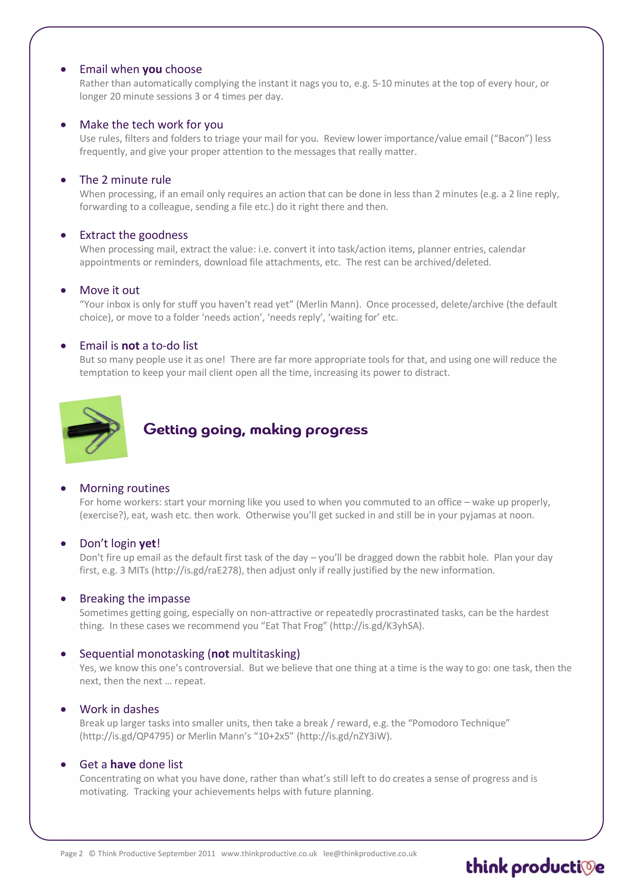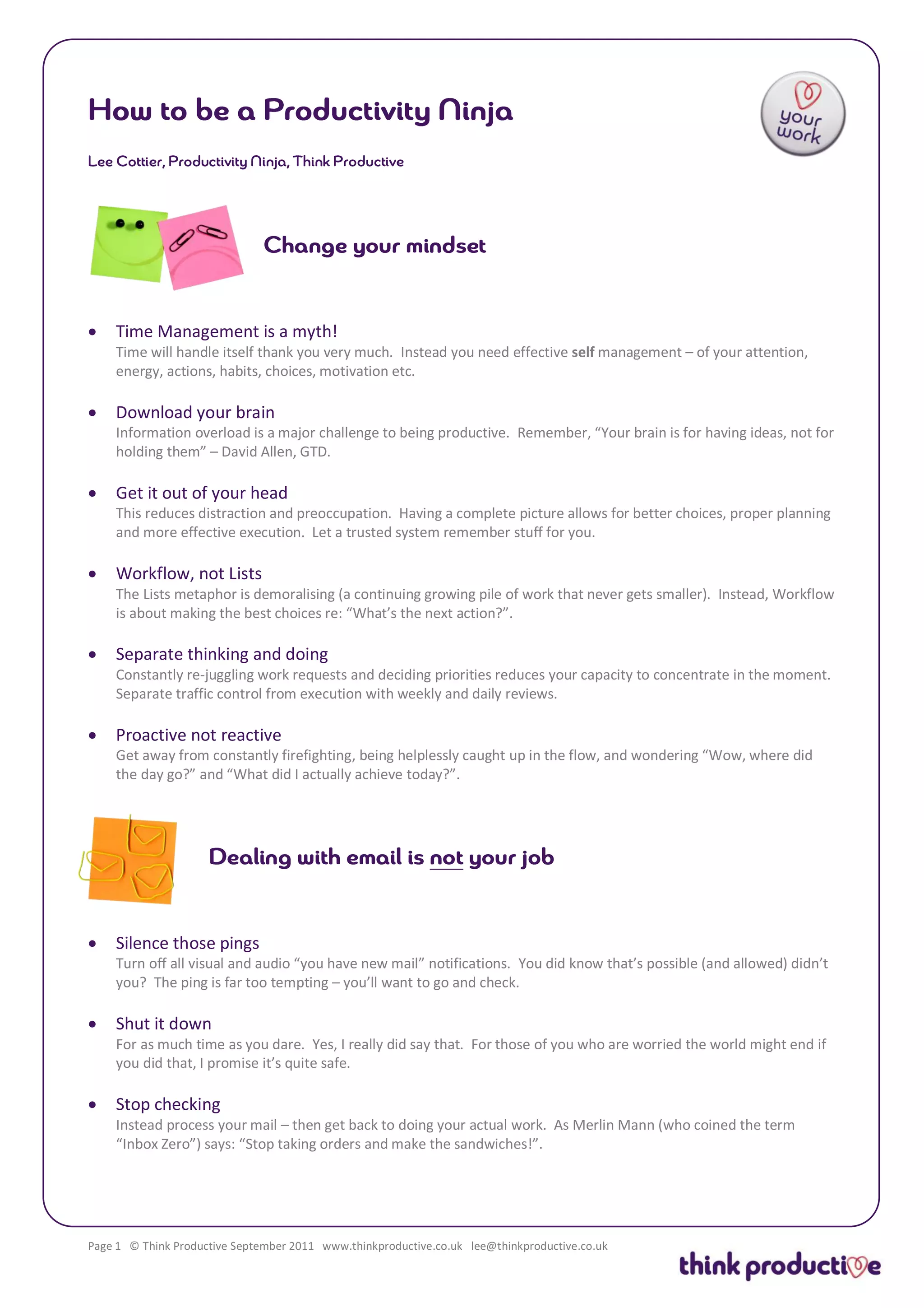 The document provides tips for improving productivity, including downloading information from your brain to reduce distraction, getting tasks out of your head and into a trusted system, focusing on workflows rather than lists, separating thinking from doing, being proactive rather than reactive, silencing notifications, taking breaks from technology, and stopping constant checking of email in favor of actually completing tasks. It recommends implementing 10 tips to make the biggest impact, stopping unproductive habits, sharing your plan with others, and signing up for a monthly productivity newsletter.