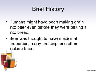 The document provides information on the history and production of beer. It discusses how humans may have started making beer before bread by soaking grains. Beer was thought to have medicinal properties and was included in many prescriptions. The document outlines the beer making process which involves mashing grains to convert starches to sugars, boiling the mashed grains with hops, fermenting with yeast to produce alcohol, and lagering/storage to mature flavors. It also discusses different types of beers including ales, lagers, craft beers, and macro breweries.