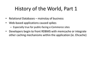This document discusses NoSQL and big data processing. It provides background on scaling relational databases and introduces key concepts like the CAP theorem. The CAP theorem states that a distributed data store can only provide two out of three guarantees around consistency, availability, and partition tolerance. Many NoSQL systems sacrifice consistency for availability and partition tolerance, adopting an eventual consistency model instead of ACID transactions.