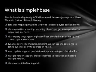 Simplehbase is a lightweight ORM framework that maps Java types to HBase data and provides wrappers for HBase operations like put, get, and scan. It allows SQL-like querying of HBase using filters and defines dynamic queries through an XML configuration file like MyBatis. Simplehbase also supports insert, update, multiple versions, and the native HBase interface.