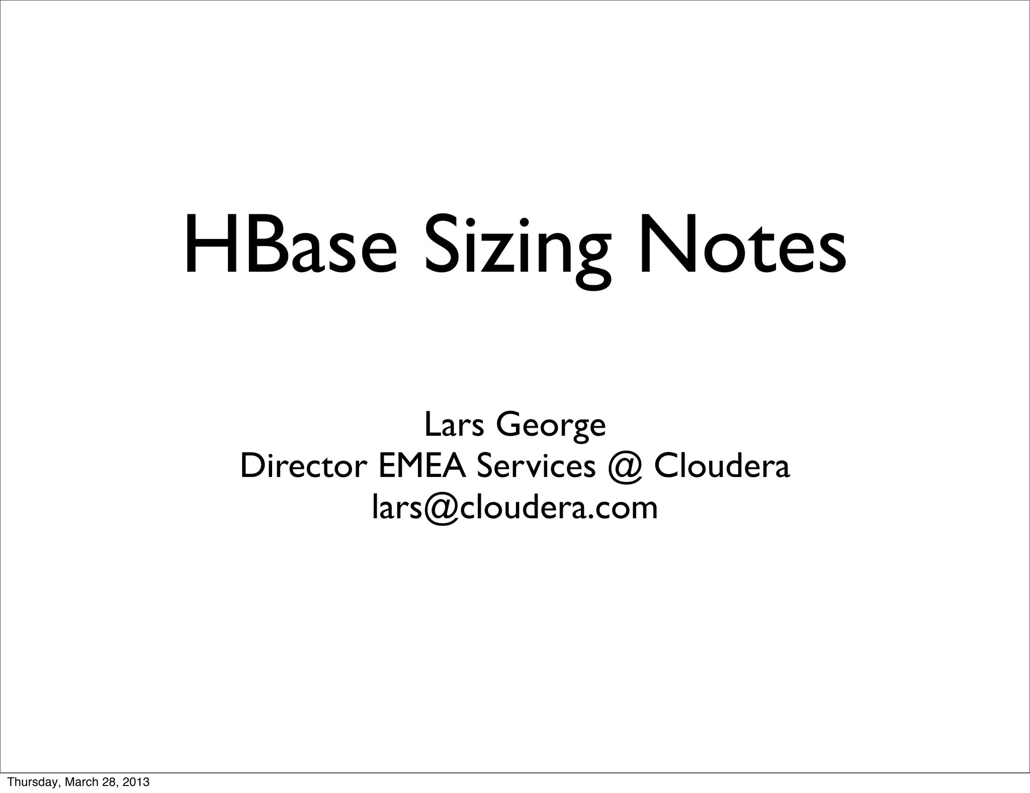 This document discusses sizing HBase clusters. It explains that HBase uses low-level resources like disk I/O, network I/O, threads, and memory, and that these resources are shared between reads and writes. It provides guidance on configuring memory sharing, optimizing reads and block caching, handling writes and flushes, avoiding compaction storms, and sizing example calculations. The document aims to help understand how HBase uses resources and configure it appropriately for different use cases.