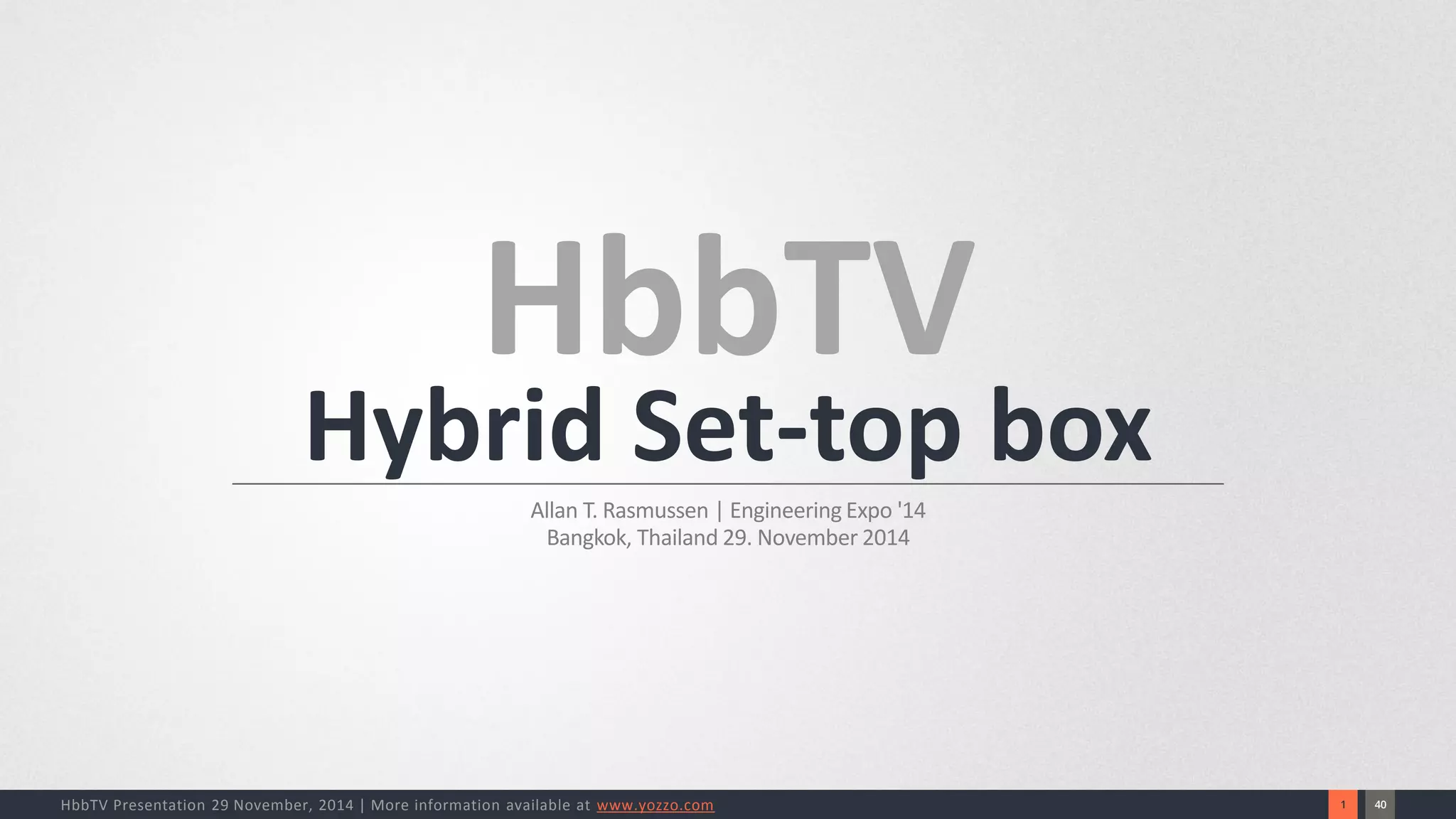 The document presents an overview of HbbTV (Hybrid Broadcast Broadband TV), an initiative aimed at integrating television with internet services to enhance the viewing experience. It discusses the current state of set-top boxes in Thailand, the advantages of digital TV, and various interactive features enabled by HbbTV, including catch-up TV and enhanced program guides. It concludes by emphasizing the importance of adopting HbbTV technology for bridging the digital divide and improving access to digital services.