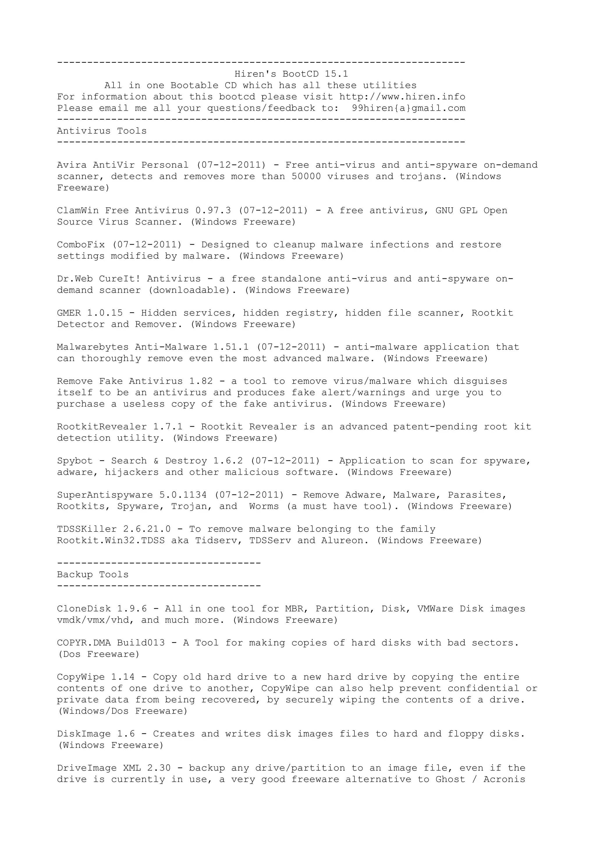 This document provides a summary of tools included in Hiren's BootCD 15.1, an all-in-one bootable CD containing various system utilities. It includes over 50 free antivirus, backup, BIOS, browser, cleaner and other tools for Windows and DOS. Some of the notable tools listed are Avira Antivirus, CloneDisk, ComboFix, DriveImage XML, GMER, Malwarebytes Anti-Malware, Partition Image and Total Commander.