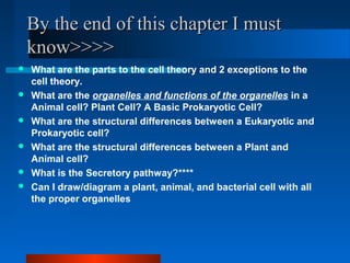 This document provides an overview of cell structure and function. It begins with the cell theory and key discoveries in cell biology. The main parts of prokaryotic, plant, and animal cells are described along with their functions. Key differences between prokaryotic and eukaryotic cells, and plant and animal cells, are highlighted. Important cellular structures like the nucleus, mitochondria, chloroplasts, and cell membrane are explained. The document concludes with a discussion of the secretory pathway and defines important cellular terms.