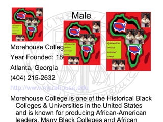 The document provides an extensive overview of various historically black colleges and universities (HBCUs) in the United States, detailing their founding dates, locations, and key educational offerings. Each institution listed, from Morehouse College to Harris-Stowe University, highlights its unique contributions to education and the African American community. Notably, the document emphasizes the diversity, historical significance, and academic programs of these HBCUs across different states.