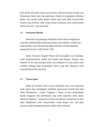 Kajian ini bertujuan untuk menentukan keberkesanan pembelajaran matematik berasaskan masalah dalam meningkatkan prestasi pelajar tingkatan 1 dalam bidang matematik. Melalui penerapan strategi pengajaran yang sesuai dan analisis terhadap kesulitan yang dihadapi pelajar, kajian ini diharapkan dapat membantu pelajar membina pemahaman yang lebih baik dan meningkatkan kemahiran penyelesaian masalah. Kesimpulan kajian menunjukkan bahawa penggunaan pendekatan penyelesaian masalah secara aktif adalah penting untuk prestasi pelajar dalam matematik.