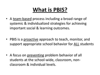 2. It outlines universal interventions that target all students (80-90%) through preventative and proactive strategies, as well as secondary interventions for some at-risk students (5-10%) and tertiary interventions for individual students with more intensive needs (1-5%).