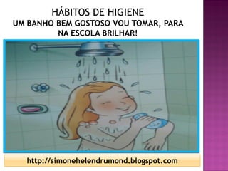 The document discusses the importance of good hygiene habits for children. It recommends taking a daily bath, washing hands before meals and after playing with animals or using the bathroom, brushing teeth after meals, washing and combing hair to prevent lice, and taking a bath after playing sports to eliminate bacteria. Maintaining clean and trimmed fingernails is also mentioned. The overall message is that developing healthy hygiene habits at a young age is important for health and cleanliness.