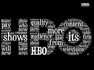 HBO is an American premium cable television network that produces high-quality original content such as award-winning series and documentaries. It launched in 1972 with a mix of movies and sports, and expanded to 24/7 programming in 1981. Notable original series in the late 1990s included Oz, Sex and the City, and The Sopranos. HBO's business model relies on $1.4 billion in annual subscriber fees, and uses its premium content to build brand awareness and drive merchandise and DVD sales. In 2010, HBO launched its HBO Go streaming service to offer subscribers access to content on multiple platforms. However, Netflix has become a strong competitor, with its U.S. subscriber numbers surpassing H