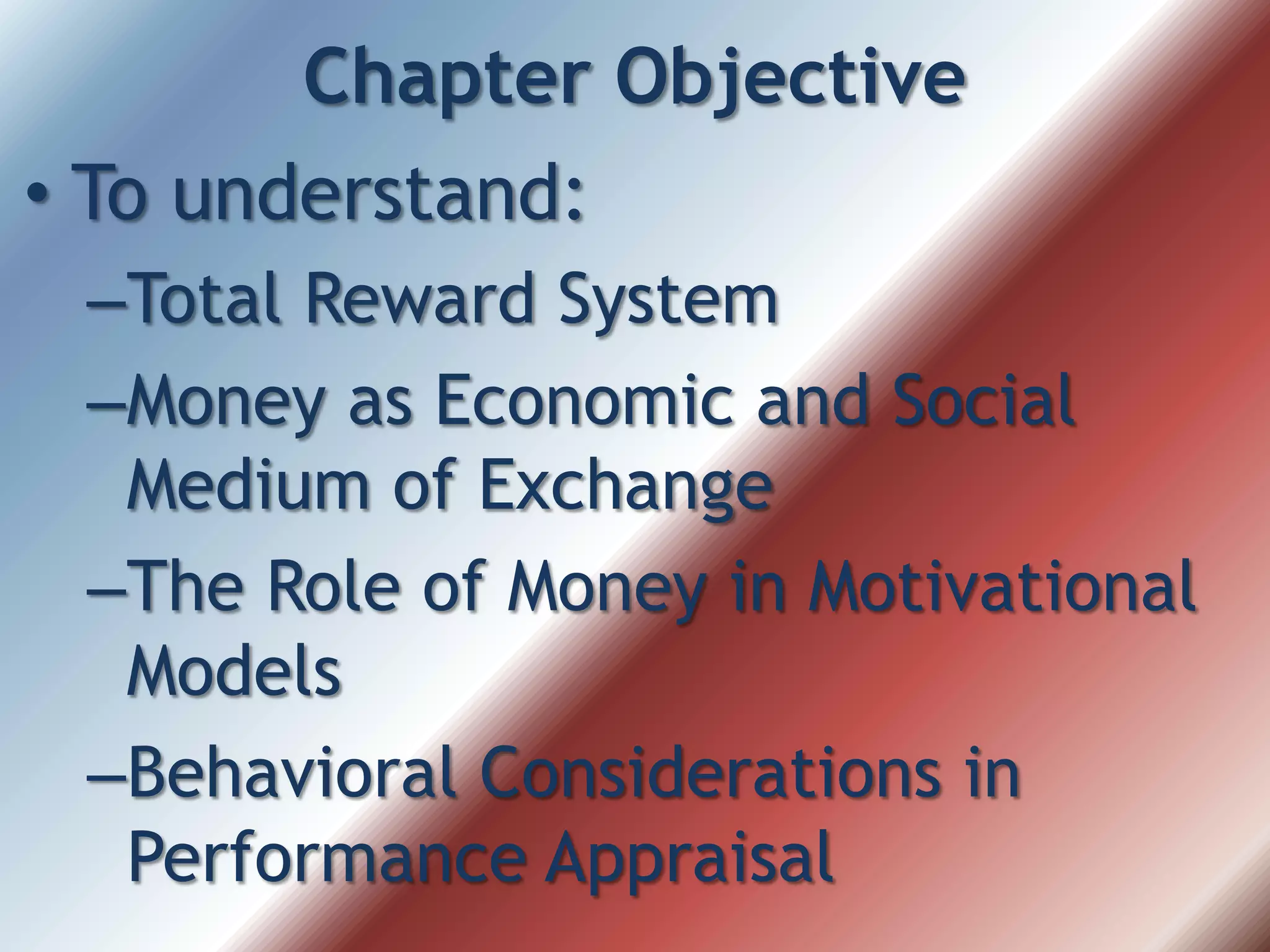 This document discusses total reward systems and performance appraisal. It covers how money acts as an economic and social medium of exchange that can motivate employees. Motivational models like drives, needs, and expectancy theories are reviewed in relation to how they influence the role of economic rewards. The document also examines considerations for applying contingent rewards and creating equitable reward systems. Performance appraisal processes like management by objectives are summarized.