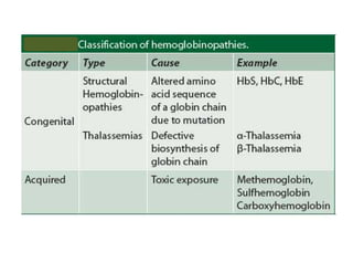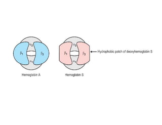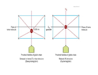 Hemoglobin is a conjugated protein found in red blood cells that carries oxygen from the lungs to tissues and carbon dioxide from tissues to the lungs. It is composed of globin and heme. Globin contains four polypeptide chains (two alpha and two beta or gamma or delta chains) and four heme groups. Heme contains iron that reversibly binds oxygen. Hemoglobin binding of oxygen is cooperative, allowing for efficient oxygen delivery to tissues. Its affinity for oxygen decreases in tissues due to Bohr and BPG effects, promoting oxygen release to tissues.