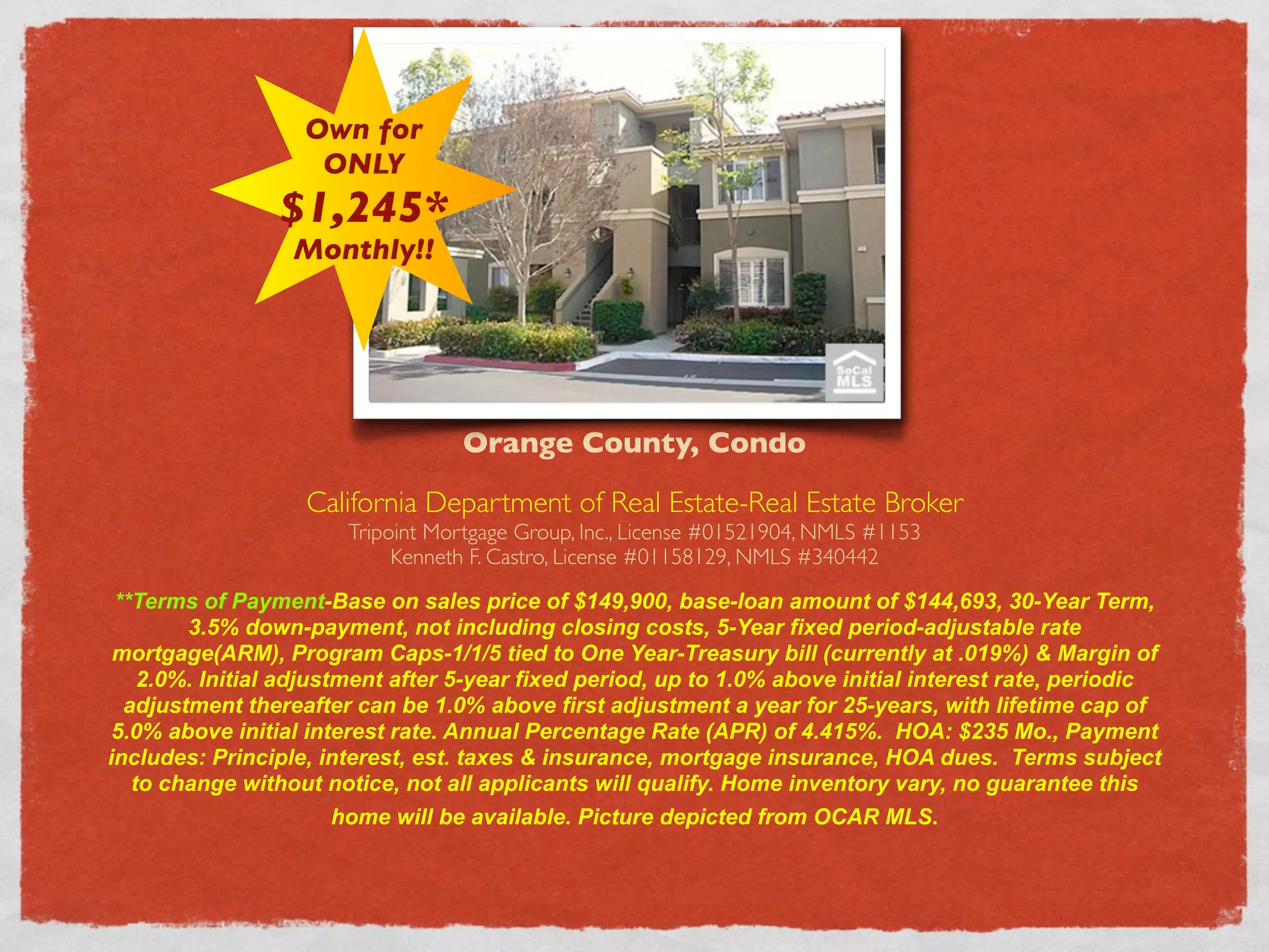 The documents advertise monthly mortgage payments for various Orange County homes. The first offers a condo for $1,245 per month based on a $149,900 sales price. The second offers a detached PUD for $2,099 per month based on a $300,000 sales price. The third offers a single family home for $2,476 per month based on a $399,000 sales price. All feature 30-year adjustable rate mortgages with 5-year fixed periods and terms subject to change.
