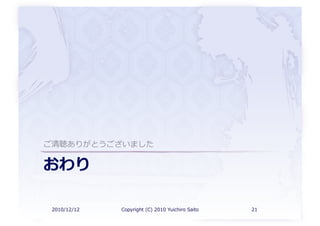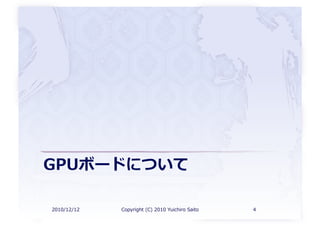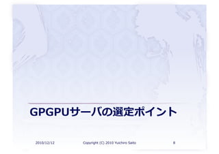 hbstudy#18 LT スライド。 GPGPU サーバの立ち上げを初めて見ようとされている方向けのハード選定のコツを解説。 詳細はブログにて。 http://www.koemu.com/blog/2010/12/12/hbstudy18/