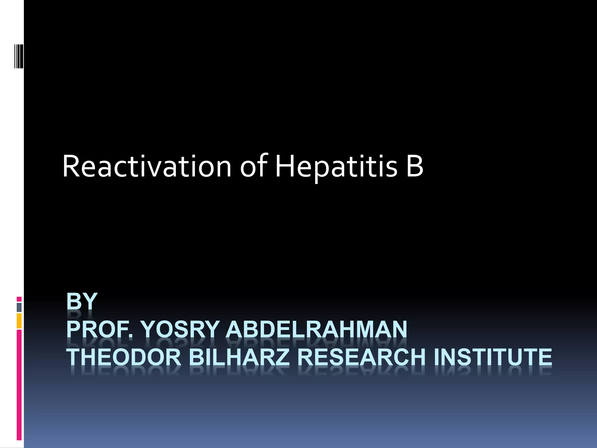 Reactivation of hepatitis B virus (HBV) can occur when a patient with resolved or inactive HBV undergoes immunosuppression. This document discusses the definition, causes, incidence, risk factors, clinical manifestations, outcomes, prevention and treatment of HBV reactivation. Key points include: screening patients for HBV before immunosuppression, using prophylactic antiviral therapy for high risk patients, and monitoring or using pre-emptive therapy for moderate risk patients. Entecavir is recommended over lamivudine or tenofovir for prevention due to lower resistance risk. Therapy should begin before and continue after immunosuppression.