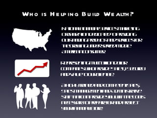 This document summarizes a marketing presentation for a financial services company called HBW. It promotes HBW's products like life insurance, annuities, and trusts which help build wealth. It highlights the growth opportunity in the industry given an aging population. Representatives can earn income from commissions on sales and build a business part or full-time with competitive products and support.