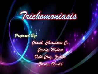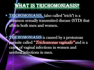 Trichomoniasis is a common sexually transmitted infection caused by the protozoan Trichomonas vaginalis. In women, it causes vaginal infections and symptoms like discharge, itching, burning and odor. In men, it can cause urethral infections and burning after urination. While most men are asymptomatic, some experience discharge or burning. The infection is treated with antibiotics. Using condoms correctly during sex can help prevent transmission, as can limiting partners and abstaining from sex if infected.