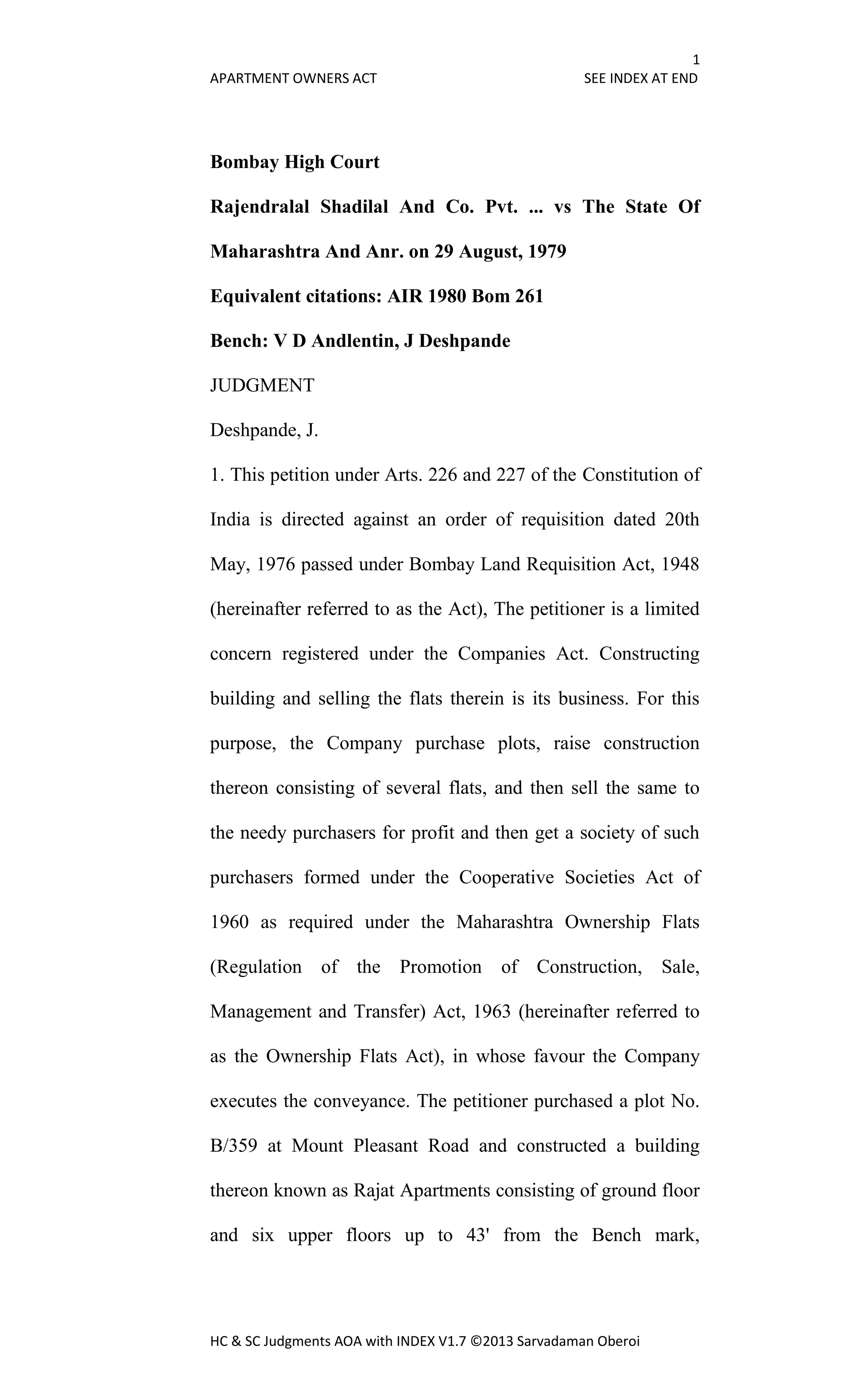 The document summarizes a court case regarding the requisition of an apartment under the Bombay Land Requisition Act. Some key points: