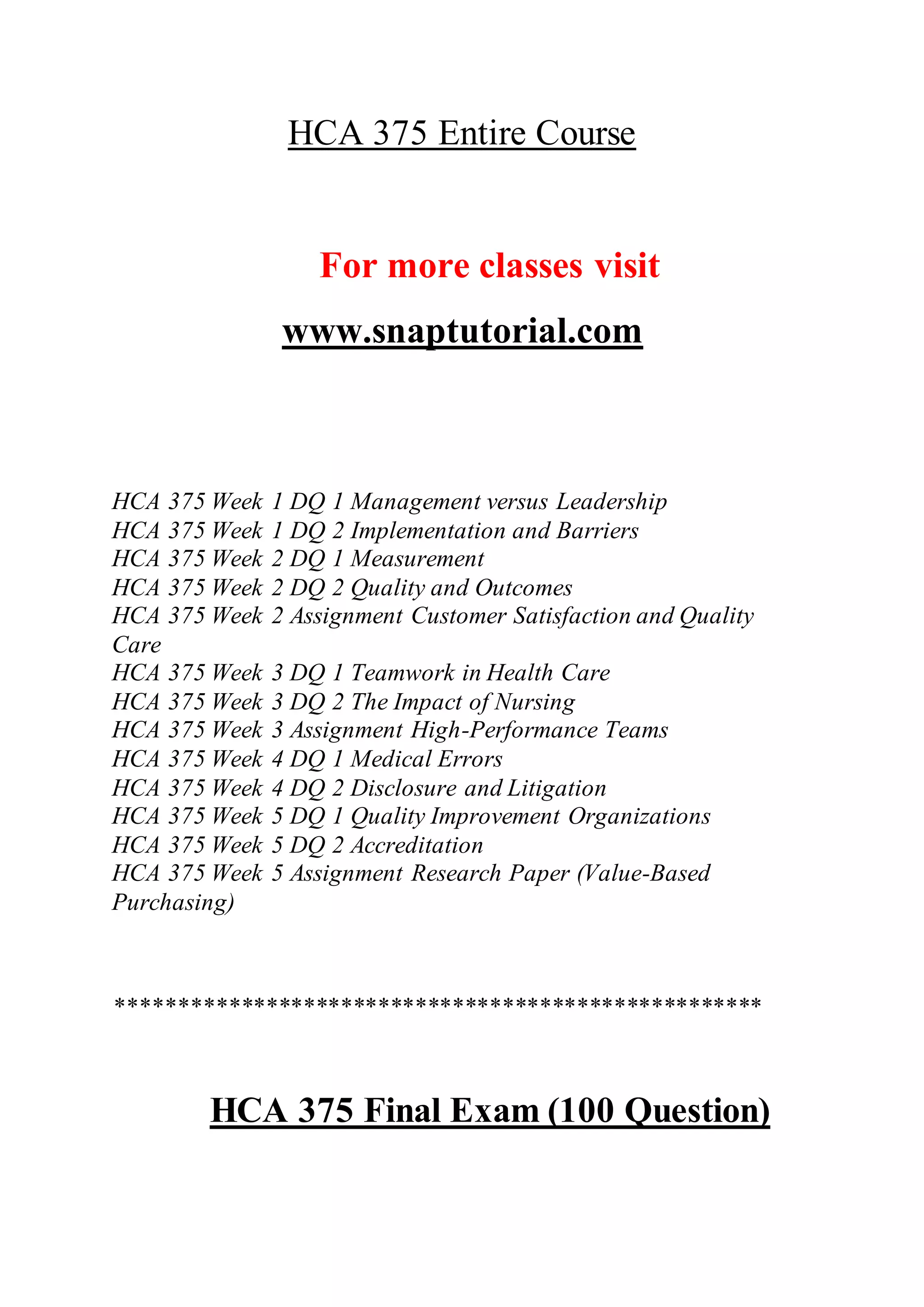 The document outlines a comprehensive course on health care administration, specifically HCA 375, detailing weekly discussion questions, assignments, and a final exam related to quality improvement in health care practices. Topics include management versus leadership, customer satisfaction, teamwork in health care, and various quality improvement methodologies like PDSA and CQI. Additionally, it emphasizes the importance of measuring patient satisfaction and includes guidelines for developing a customer satisfaction improvement plan.