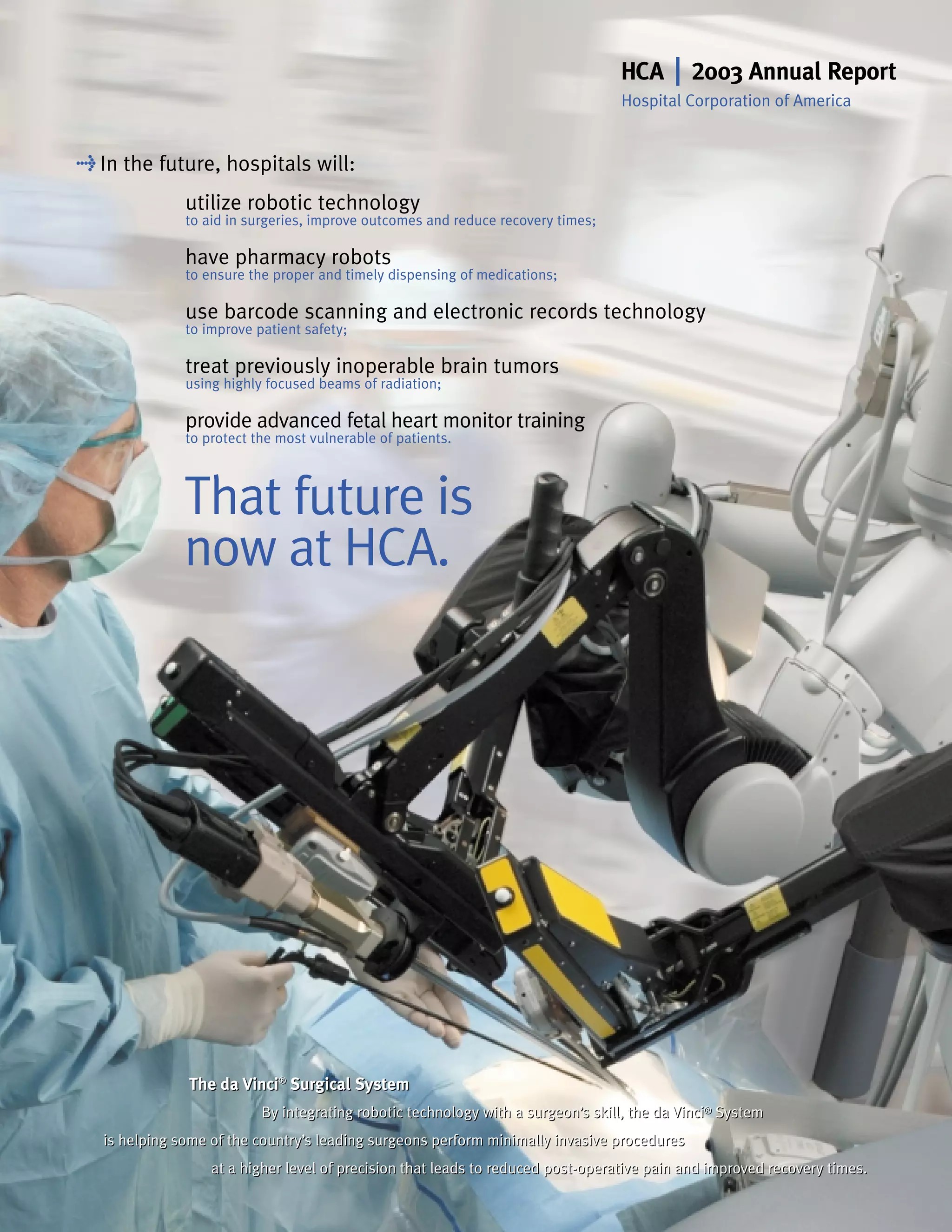 HCA's 2003 annual report discusses developments that positioned the company for future growth. Key points include: 1) HCA invested over $1.8 billion to update its existing facilities with new technology and increase capacity. 2) The acquisition of Health Midwest expanded HCA's presence in the Kansas City market. 3) HCA invested $130 million to improve its revenue management and supply chain operations by consolidating them into regional centers. 4) New patient safety technologies like barcoded medication administration were deployed across HCA hospitals.