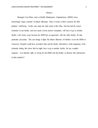This document presents an ethical dilemma faced by Alan, a cancer patient undergoing treatment. Alan had been receiving treatment at University Hospital but learned he would need a bone marrow transplant. However, his HMO would only cover the procedure at a facility hours away. This poses the ethical question of whether the HMO and University Hospital should have informed Alan earlier that more complex procedures may not be covered at the original facility. The document analyzes this dilemma and how a healthcare manager should ensure patients are fully informed of coverage limitations to make the best decisions about their care.