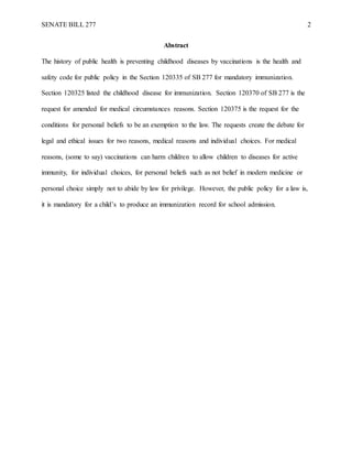 Senate Bill 277 in California sought to eliminate exemptions from mandatory school immunization requirements for personal beliefs. It aimed to prevent unvaccinated children from attending school and spreading infectious diseases. However, some argue this denies education and parental choice. Supporters counter that mandatory immunization is based in science and public health policy to protect vulnerable children. The impact of removing exemptions would be to help control diseases and align with principles of public health to prevent sickness in society through organized community efforts like immunization programs.