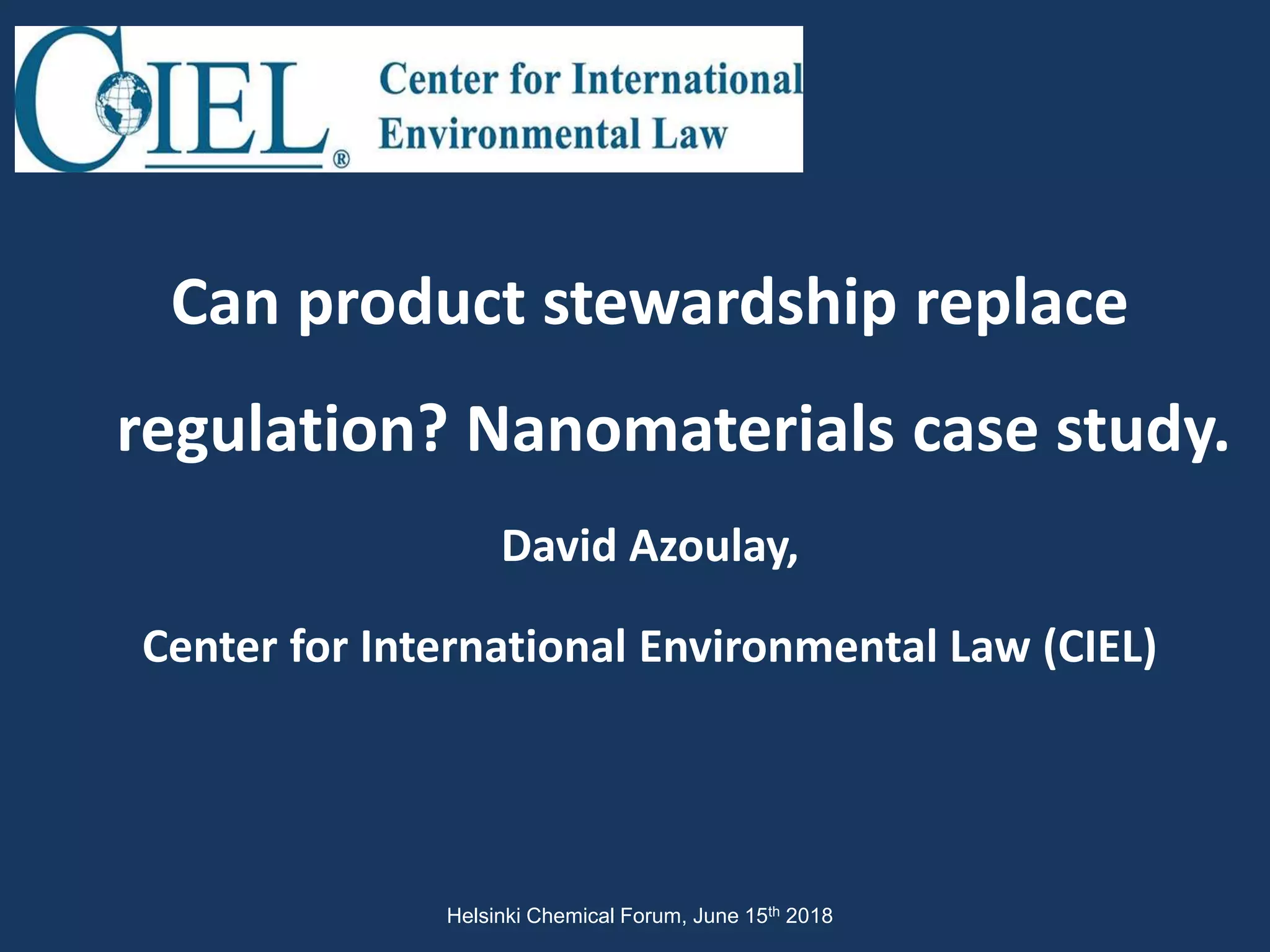 The document discusses the potential of product stewardship as an alternative to regulation in managing nanomaterials, highlighting lessons learned from past regulatory experiences. It emphasizes the importance of precaution-based regulation in driving innovation and improving environmental and health outcomes. The presentation suggests that stricter laws can foster new inventions and alternatives beneficial for society.
