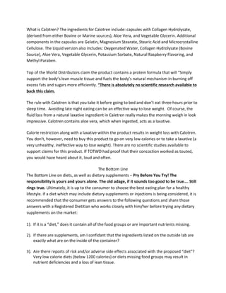 The document warns about empty weight loss promises and dubious diets and supplements being promoted in 2012. It highlights two such programs - the HCG diet, which uses injections of a pregnancy hormone along with severe calorie restriction but has no proven long-term effectiveness or safety, and Calotren, a supplement that claims to burn fat but actually causes weight loss through calorie restriction and its laxative property of aloe vera. The document advises consumers to be skeptical of miracle cures and do their research before trying questionable diets or supplements.
