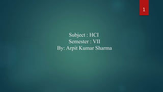 This document provides an overview of the subject of Human-Computer Interaction (HCI). It discusses the historical evolution of HCI from early computers to modern interfaces. It also covers key concepts like interactive system design, usability engineering, and the relationship between HCI and software engineering. The document outlines several topics that are important to HCI like GUI design, prototyping techniques, and research areas in HCI including ubiquitous computing and embedded systems.