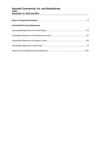 This document provides the consolidated financial statements of Hyundai Commercial, Inc. and its subsidiaries for the years ended December 31, 2012 and 2011. It includes the consolidated statements of financial position, comprehensive income, changes in equity, and cash flows for 2012 and 2011, as well as notes to the financial statements. The report of the independent auditors expresses an unqualified opinion that the consolidated financial statements present fairly the financial position, results of operations and cash flows of Hyundai Commercial, Inc. and its subsidiaries in accordance with Korean IFRS.